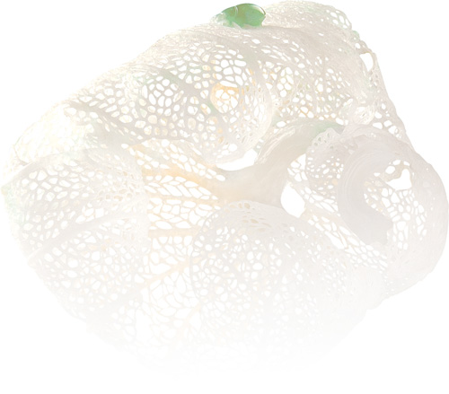 With In Praise of Life, part of the "Nine Fields of Orchids" series, Hu escapes the bounds of traditional jadeite art by incorporating the very modern motif of a skull into the work. By combining the skull with the orchid theme, Hu successfully creates imagery with an understated poetic sensibility. Having studied Buddhist doctrine seriously from a young age, he often asks himself: Wherein lies the value of life? When a person comes to the end of life, what gift has he left for himself?