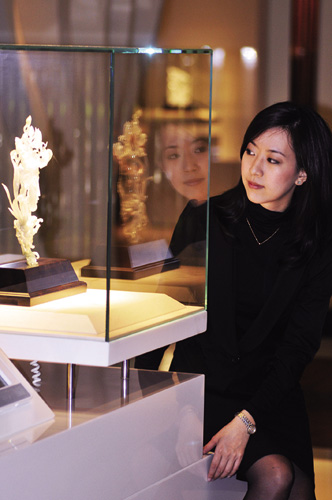 The museum covers a mere 200 ping of floor space, but in every nook and cranny one runs across evidence of the proprietor's painstaking efforts to incorporate art into the tiniest little details of the facility. The restroom washbasins are fitted with faucets resembling a lotus plant, in which a modern infrared sensor is juxtaposed with water gushing from an artfully carved jadeite lotus pod. Then there are the dragon and lion heads of inky jadeite standing watch over the exit, and the figure of a pot-bellied pixiu, a mythical beast that symbolizes bravery, "pressed into service" in place of the cat figurine that typically beckons to visitors to stop in and shop.