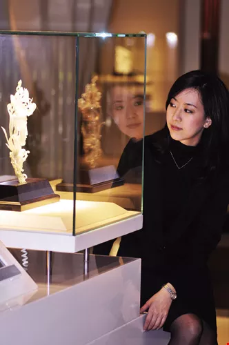 All the display cases at the Museum of Jade Art are freestanding to allow visitors to get a 360-degree look at the exhibit pieces. Shown here is Downward Gaze.