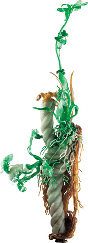 Life's Beginning, 48 x 15 x 15 cm, 2008 A stout knotted rope, woven from fine strands, symbolizes the supple strength of a mother's love. Two orchids grow out of the rope, one wilted and one in full bloom, symbolizing the circle of life and death. Not to be overlooked are the cicada emerging from its shell at the base of the rope, an insect preparing to take off in flight at the rope's mid-section, and flitting butterflies at the top.