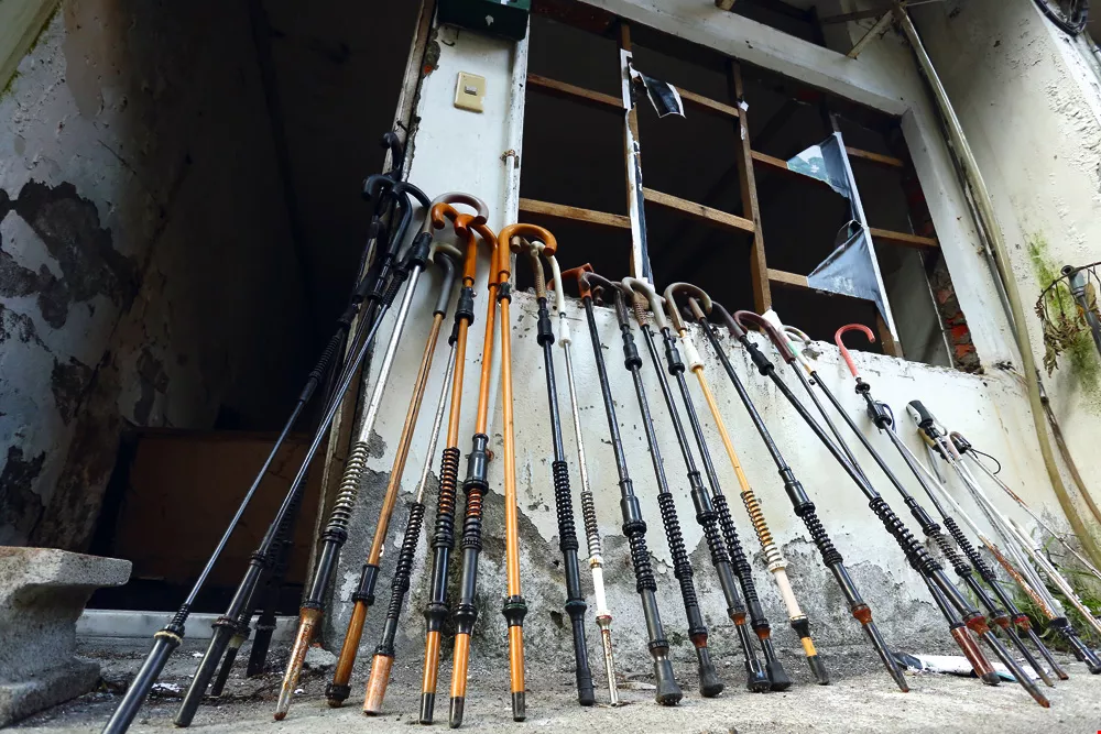 The people have left Huanmin New Village and the houses are empty. In this photo, artists calling for preservation of Toad Mountain’s history have put canes left behind by relocated former residents on display.