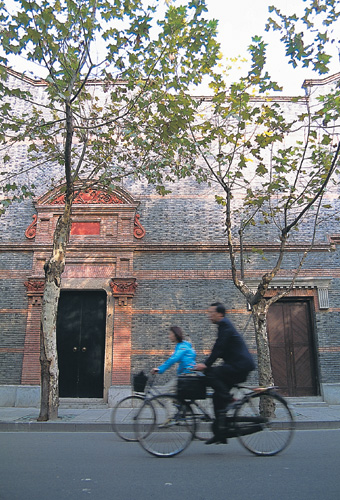 Shanghai residents cycle through the Shikumen area. The locale's architectural style has not been eclipsed by the new Xintiandi complex, maintaining a balance between new development and preservation of the city's old appearance.