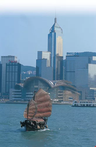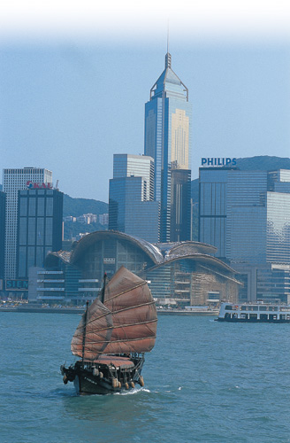 A junk sails through Victoria Harbour against the backdrop of the Hong Kong Convention and Exhibition Centre. The center, which is reminiscent of the Sydney Opera House, was built in 1997 on land reclaimed from the sea. (photo by Diago Chiu)