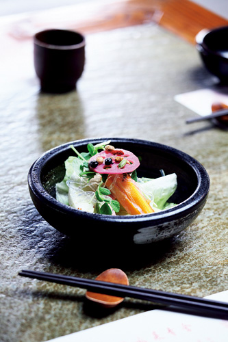 Chef Ho says that vegetarian fare gets much of its flavor from sauces. Cedar sauce, wafu dressing, XO sauce, and one made from fermented tofu and miso nicely complement vegetarian dishes.