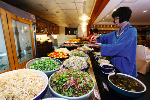 The international media has named Taiwan a “vegetarian paradise” for its tremendous variety of vegetarian restaurants. At left, Shuilai Qingshe. At right, the buffet counter at Taipei’s Spring Natural Vegetarian Restaurant.