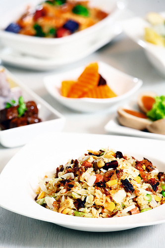 Most of Taiwan’s new vegetarian restaurants feature innovative cuisine. The upper photo shows Hong Kong-style XO fried rice, and the lower, spicy noodles with basil.