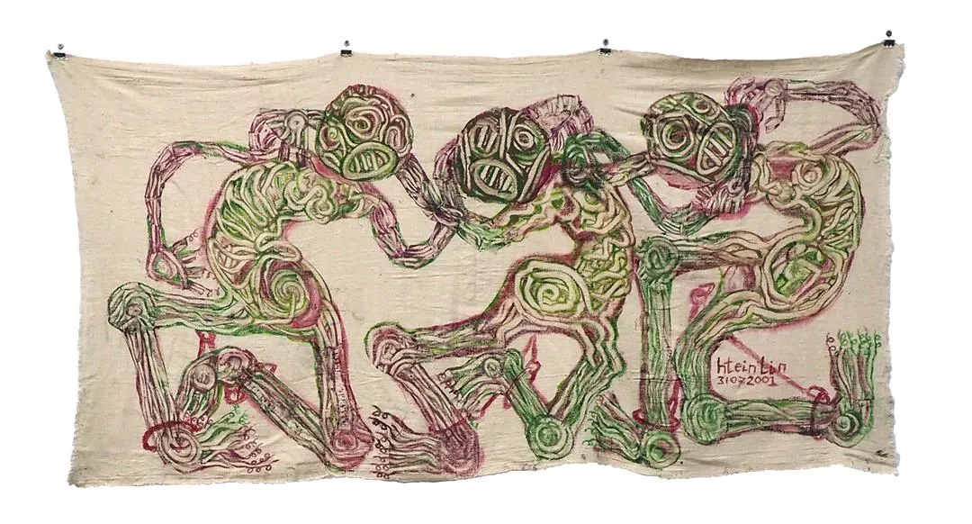 Myanma artist Htein Lin repurposed prison uniforms as canvases to create his “00235” series during his incarceration.