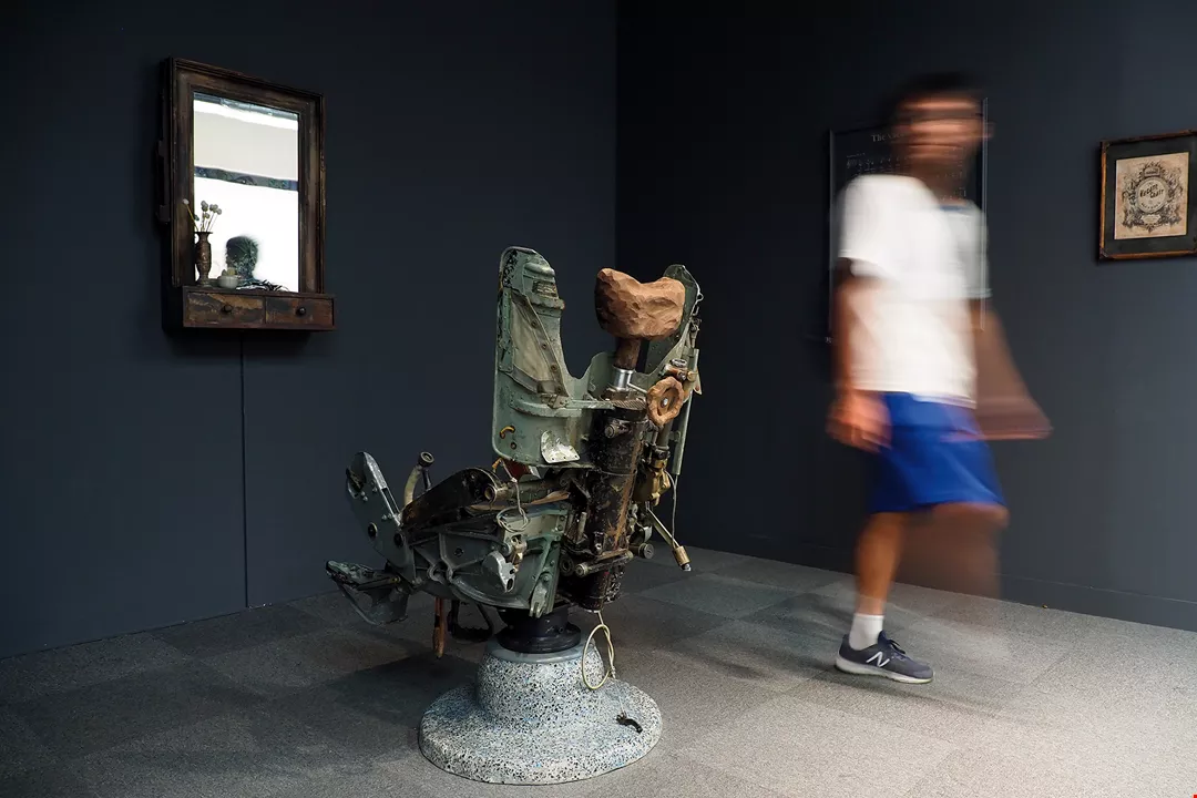 Bang Nhat Linh’s The Vacant Chair (2013–2015) depicts conflict and tolerance in the aftermath of the Vietnam War. In the work, a video of a South Vietnamese barber shaving a former North Vietnamese soldier plays in front of the pilot’s seat from a fighter plane recast as a barber’s chair. (photo by Jimmy Lin)