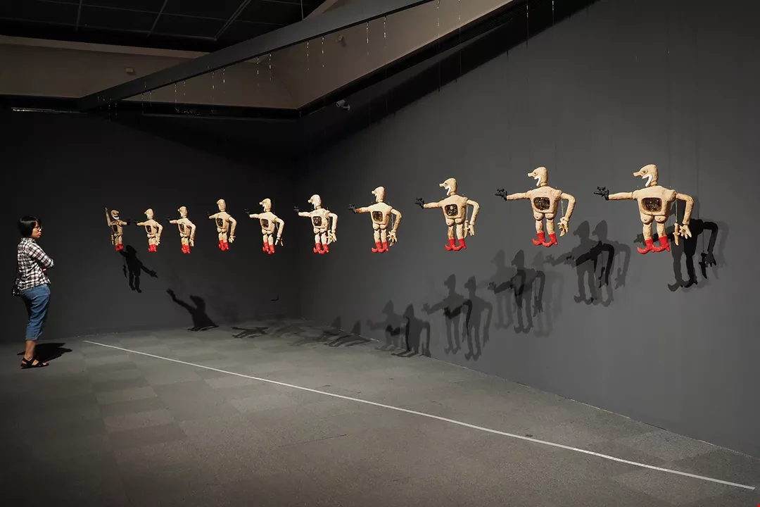 In Heri Dono’s Badman (1991), nine Indonesian shadow puppets point guns at a tenth puppet, also with a gun, leaving the viewer to guess which side is in the right.
