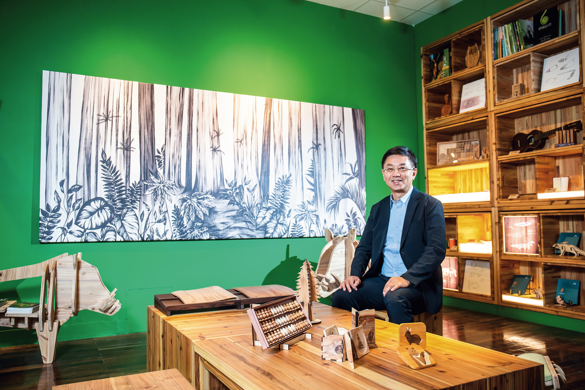 Since becoming director of the Forestry Bureau, Lin Hwa-ching has been actively pursuing a policy of promoting domestic forestry products. He meets with guests in a room that displays items made with Taiwanese timber.