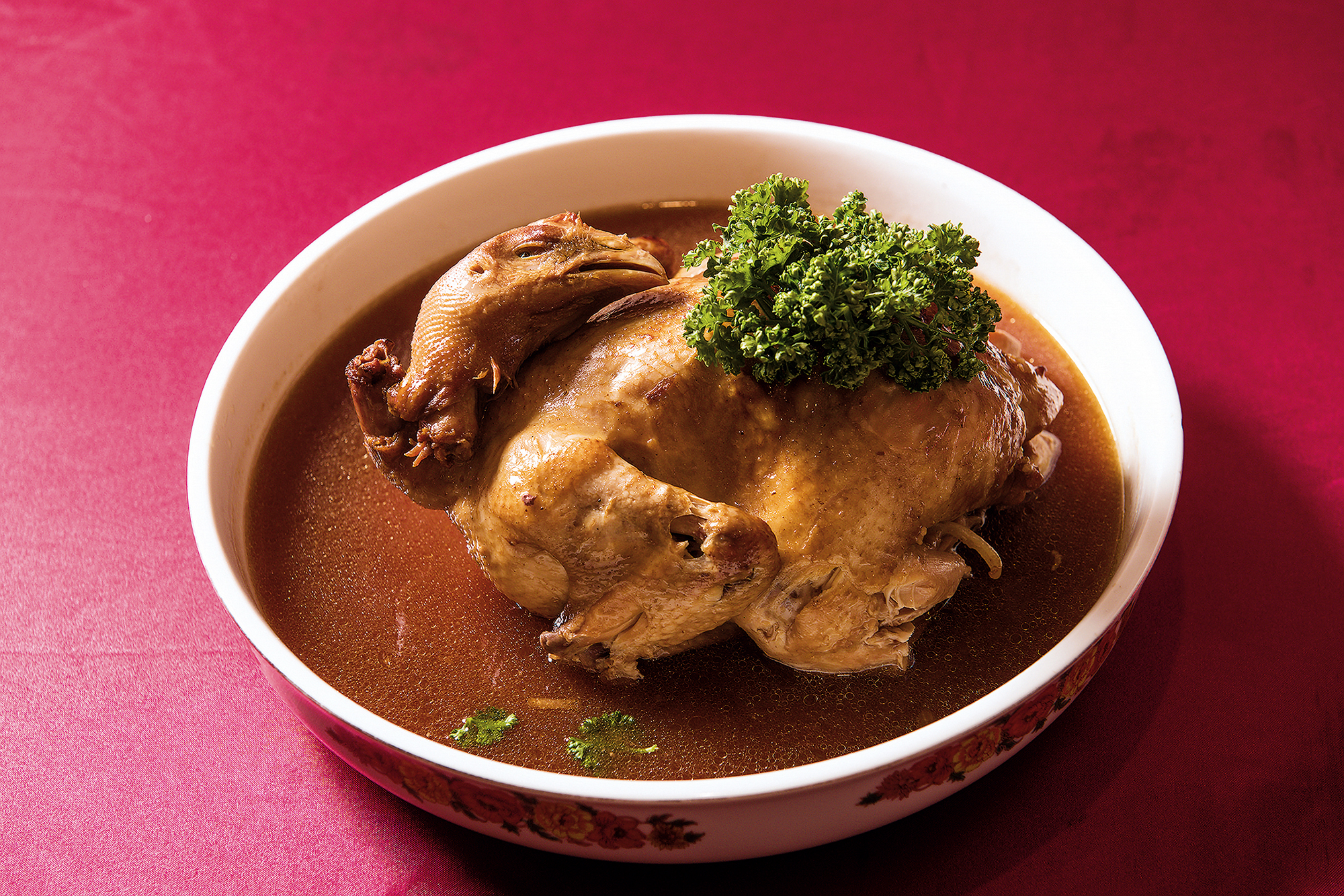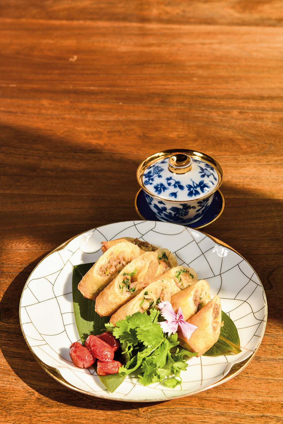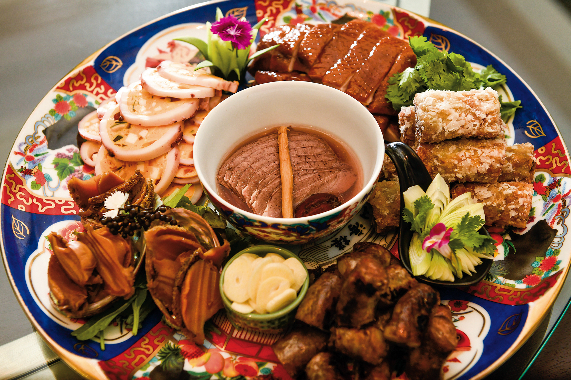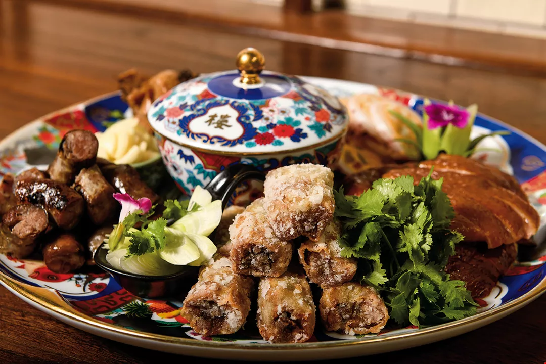 Here one can enjoy “cabaret cuisine” (jiujiacai) that goes back to the Japanese era, featuring items such as flatfish spring rolls—stir-fried flatfish, beansprouts, and shrimp meat wrapped in crispy, golden spring roll wrappers, served in gold-edged porcelain bowls with a side helping of chicken broth. Fresh and flavorsome, while these dishes seem familiar, they nevertheless have a pleasing unfamiliarity to them.