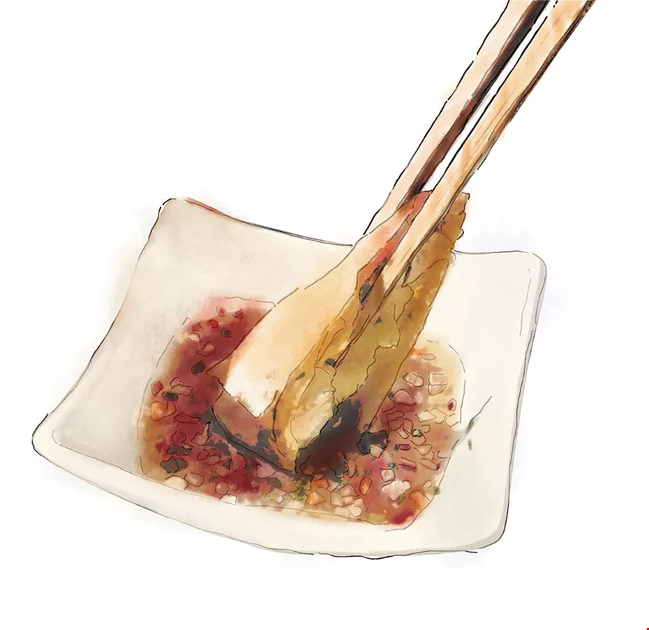 The street food, similarly born of a need to make do with meager resources, was strangely reminiscent of that found in Tainan. The taⁿ-a-mi (also known as danzi noodles) of Taiwan had its counterpart in the local shrimp noodles, Taiwan’s “chicken rolls” (actually pork rolls) were known as lor bak, and even Hakka leicha was available, albeit in a savory form rather than the sweet Taiwanese style. The comparisons between the two revealed the little secrets of their respective pasts.