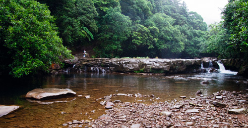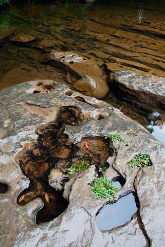 Erosion from the creek’s flowing water has cut holes into the rock in the shape of a bird.