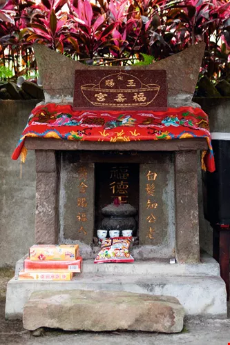 Earth God shrines in Shuangxi are all made of simple ashen sandstone, unpainted and unadorned. On the roof are a pair of horn-shaped protuberances, indicating that the structure was built in the era of Japanese rule. Since it is in such a remote location, it still maintains its original, simple facade.