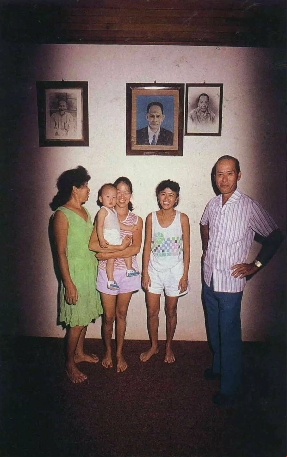 Wu Yun-chang (right) and family pose for a group portrait. The photographs on the wall show five generations. At left is Wu's grandfather, who never went to Tahiti, and at right are his parents, who immigrated there from Kwangtung. He himself was born and raised on the island.