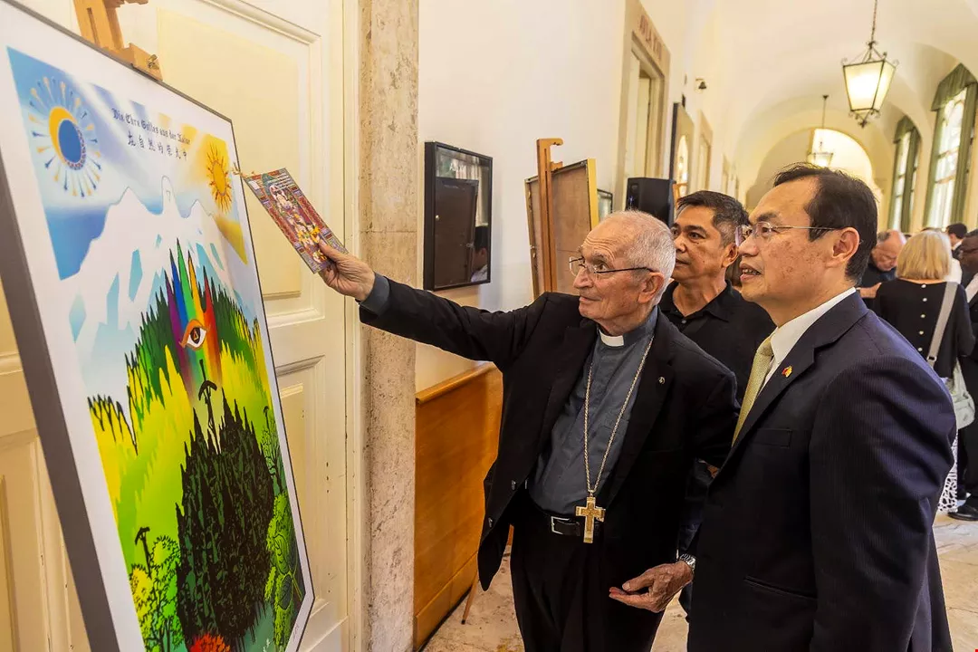 Cardinal Silvano Maria Tomasi (left), the Vatican’s special delegate to the Sovereign Order of Malta, is shown here with Anthony C.Y. Ho (right), ambassador of the ROC Taiwan to the Holy See, at the exhibition Gloria: Taiwanese Artist Hsieh Sheng-min’s Religious and HOPE Artworks, held at the ROC Taiwan embassy at the Vatican. (courtesy of Hsieh Sheng-min)