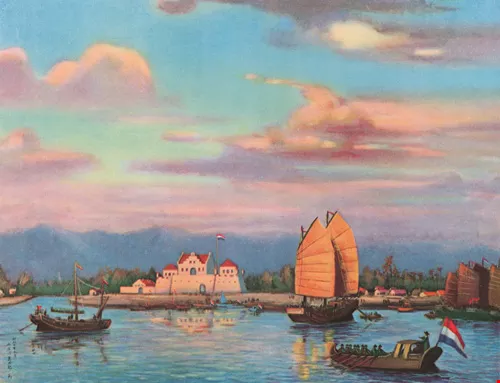 With the story of Three Families in Formosa, set in old Tainan, Chen Yao-chang has added to our understanding of modern history in Taiwan. Shown here is a sunset scene at Fort Provintia, painted by Tokushiro Kobayakawa. The beautiful fort and the boats plying the river show that old Tainan was a vibrant city.