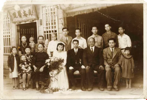 Chen Yao-chang comes from a family of practicing physicians, and the excellent education he received at home laid the foundation for his later success. He is shown here in the 1950s as a tyke in his mother’s arms. The whole family is posing in front of their medical clinic to mark the wedding of Chen’s uncle. Second from the right is Chen’s father, and third from the right is his grandfather. Sitting next to the bride is Chen’s grandmother.