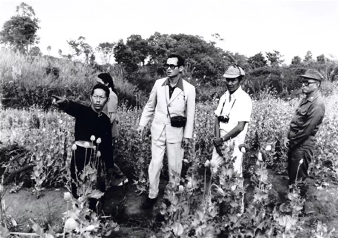 The Royal Project Foundation was launched by King Bhumibol Adulyadej (second from right). The photo shows him and Prince Bhisatej Rajani (right) inspecting opium poppy fields in 1969.