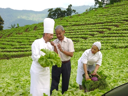 In February 2012, Prince Bhisatej Rajani invited foreign representatives to visit Angkhang Farm in northern Thailand. Here they are tasting organic lettuces.