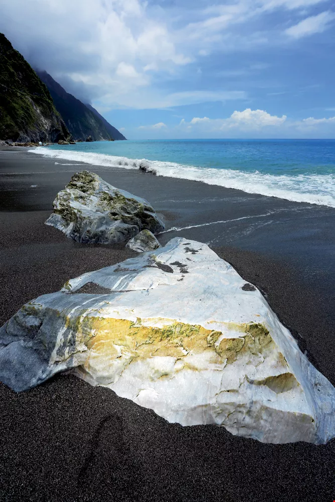 On the beach at the foot of Qingshui Cliff, the marble rocks give off a marvelous, almost other-worldly white glow.