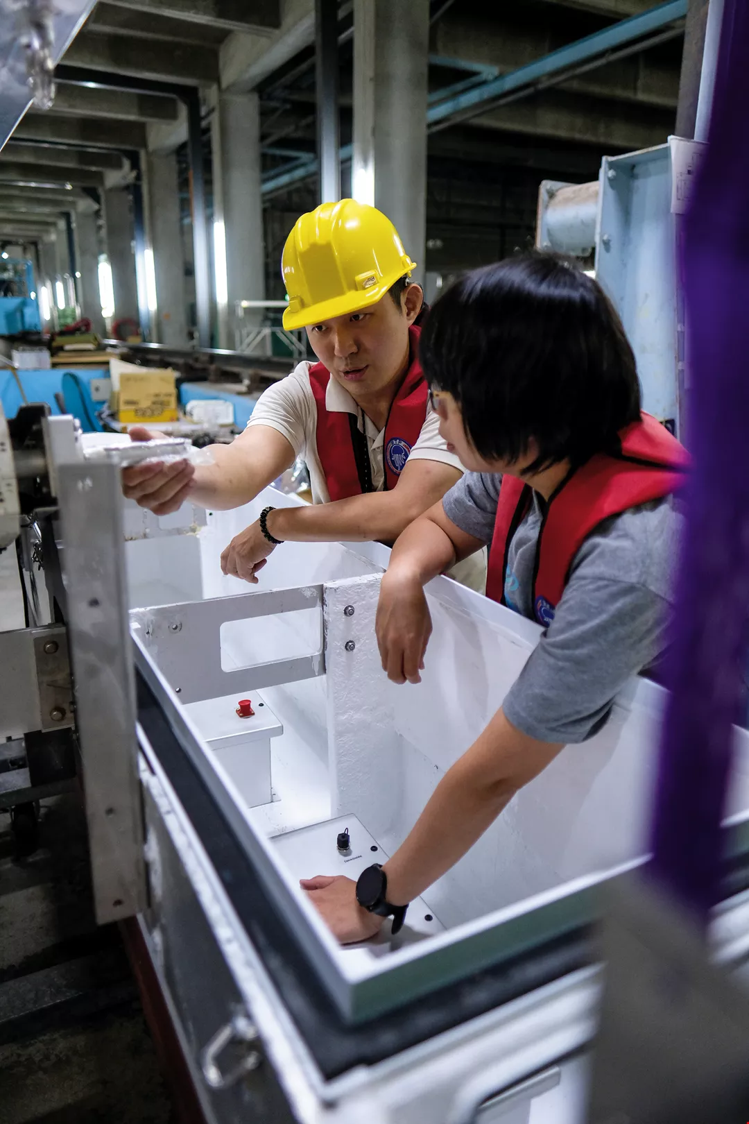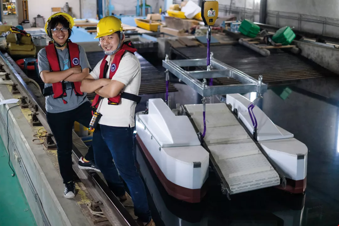 Chen Szu-ying and the team’s systems engineer install a battery pack in a trash skimmer.