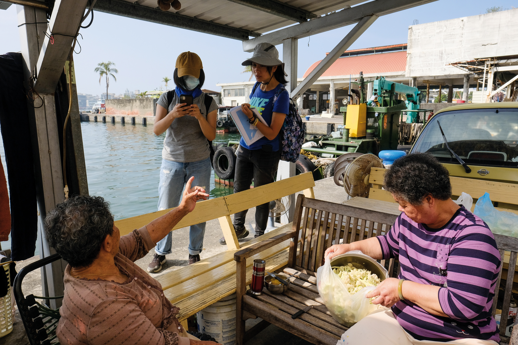 “Note the wind,” Chen tells her teammates, pointing to a flapping flag and reminding them of the wind direction’s influence on where trash accumulates. She then observes the kinds of trash floating on the water’s surface. Tseng spots a trashcan, and is thrilled to see a warehouse with recyclables arranged neatly inside. In addition to noting what they see for themselves, team members fill out their picture by interviewing workers on some of the fishing boats.