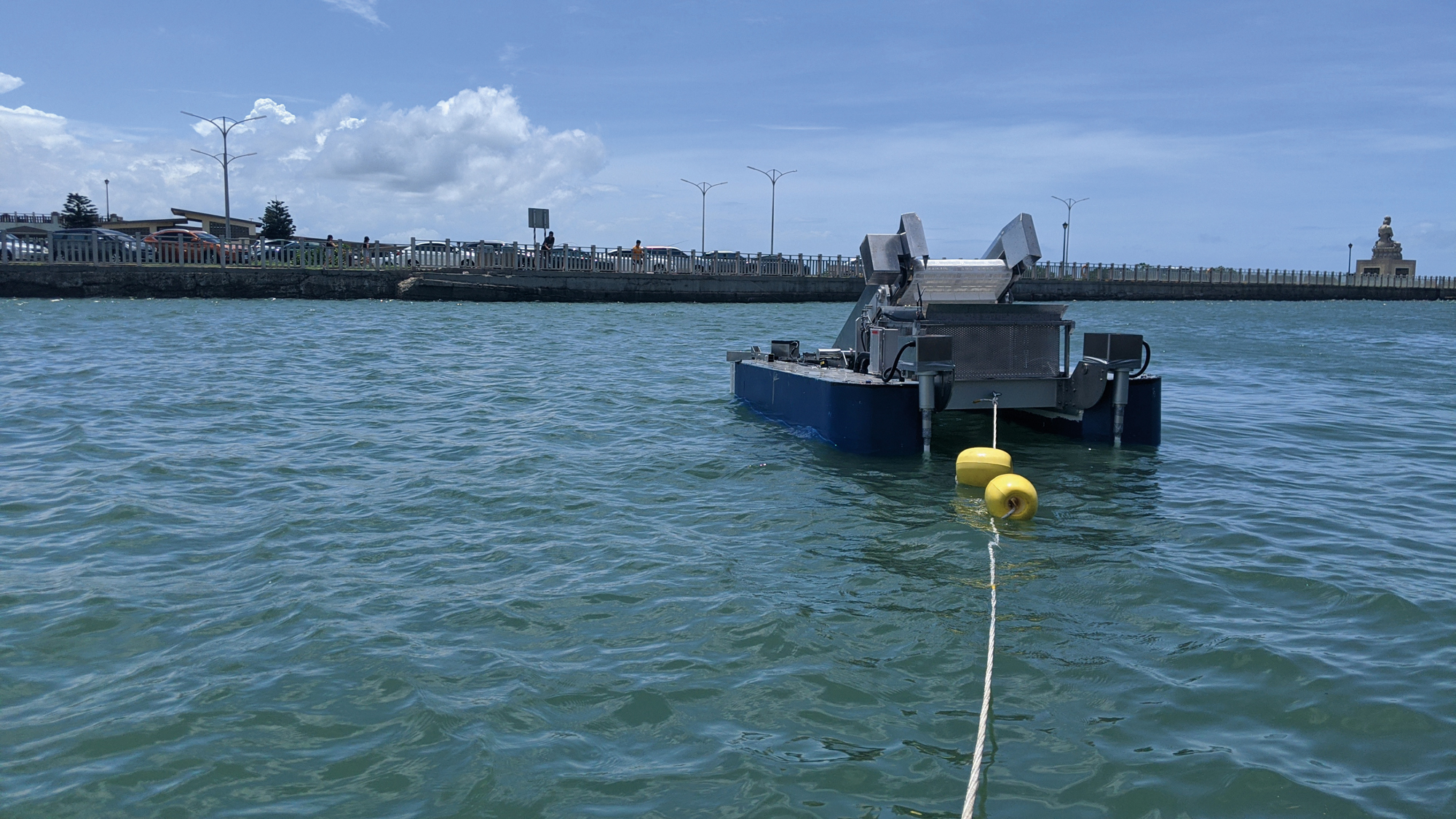 Testing a trash skimmer at Yong’an Fishing Harbor in August 2020. (courtesy of Team Azure)