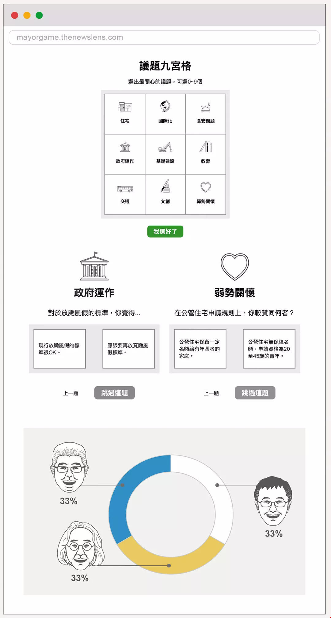 The game shocked many netizens when they found that the candidates they supported did not necessarily hold the same political views as their own. This cognitive gap not only reflected the fact that voters overlook candidate’s positions on issues but also broke through citizens’ blind spots in discussions of municipal policies. After the game ended, more than 70% of the players continued to read in-depth reports on News Lens International and joined discussion forums to familiarize themselves with various aspects of interrelated issues.