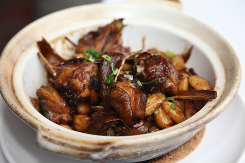 How is it made? First, select a young, tender, two-pound chicken, pluck it and remove the bones and viscera, then wash it and chop it into small pieces. Put these into a ceramic pot, and add one cup each of soy sauce, cooking oil, rice wine. Then add chopped ginger and scallions, cover tightly and cook gently until it boils, stirring once every 10 minutes to prevent burning. Then stew for about half an hour until the chicken meat softens and the liquid thickens. Before serving, remove the ginger and scallion pieces, add a few drops of sesame oil, and serve in the pot.