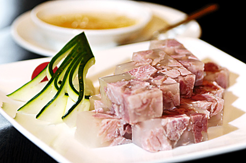 Put the marinated pork shanks in a cooking pot, add scallion, ginger, Shao-xing wine, Sichuan pepper, star anise and master sauce (a soy-based sauce), and cook on a high heat until boiling, simmer over a low heat for one and half hours, stir the shanks briefly, and continue to simmer for one hour more. Remove the shanks and pour a small amount of the cooking liquid over them, using a heavy tool to press tightly on the shanks. Wait until the shanks have cooled. The result is pork trotters in aspic. Before serving, slice ?the trotters and present them on a plate with sliced ginger and Zhenjiang vinegar.