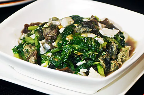 The second dish is Kaoting Shuang Jiao: fried red spinach (amaranth) with both preserved and salted eggs.