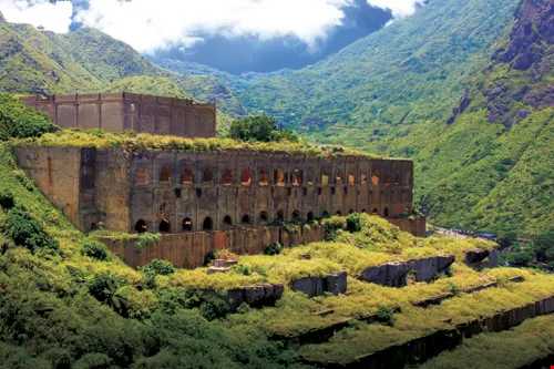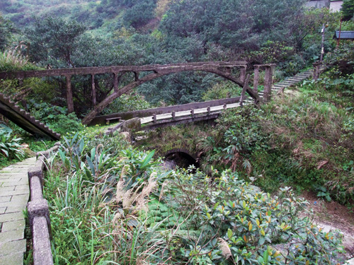 The ruins of old sluices at Jinguashi: the upper levels are Japanese built, the mid-level is from the post-war period, and the lower level was constructed in the Qing Dynasty.