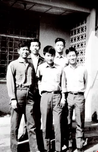 Several young poets visit Chen Chien-wu in Fengyuan in 1968. (front row, left to right:) Chen Chien-wu, Jian Cheng, Lee Min-yung. (back row, left to right:) Cheng Chiung-ming, Chen Ming-tai.