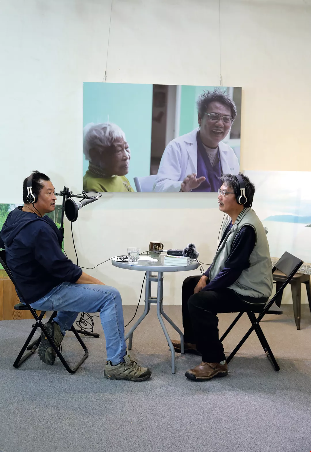 Dr. Hsu (right) chats with Taitung artist Iming Mavaliw on his radio show, part of his regular talks on the air with his supporters.