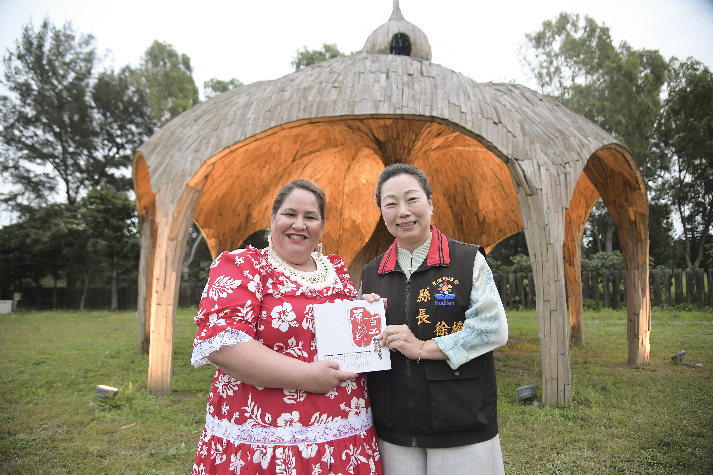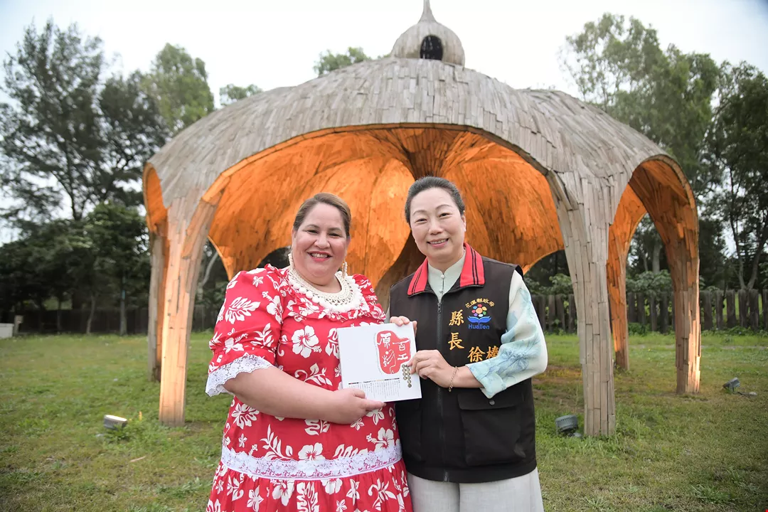 Hualien County magistrate Hsu Chen-wei presents a copy of the book Arts and Crafts of the Hualien Indigenous People to Ambassador Kattil, and the two pose for a commemorative photo at the Hualien County Indigenous Peoples Cultural Center. (courtesy of Hualien County Government)
