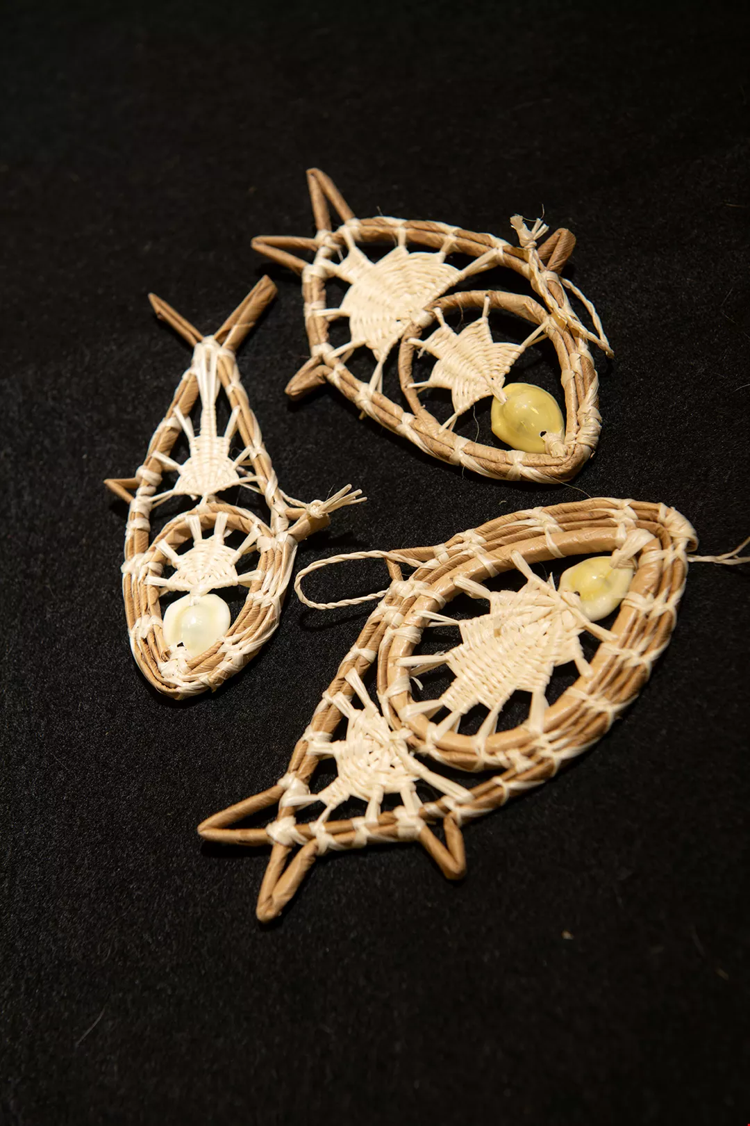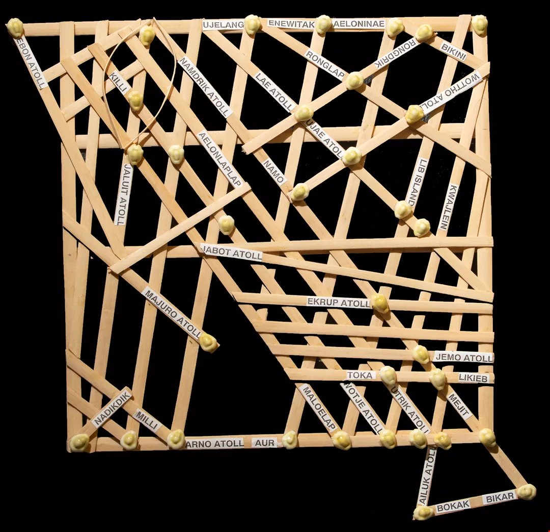 This “stick chart” has 24 shells attached to it, representing the RMI’s inhabited islands and atolls. Each of the sticks (made from the midribs of coconut fronds) represents an ocean current.