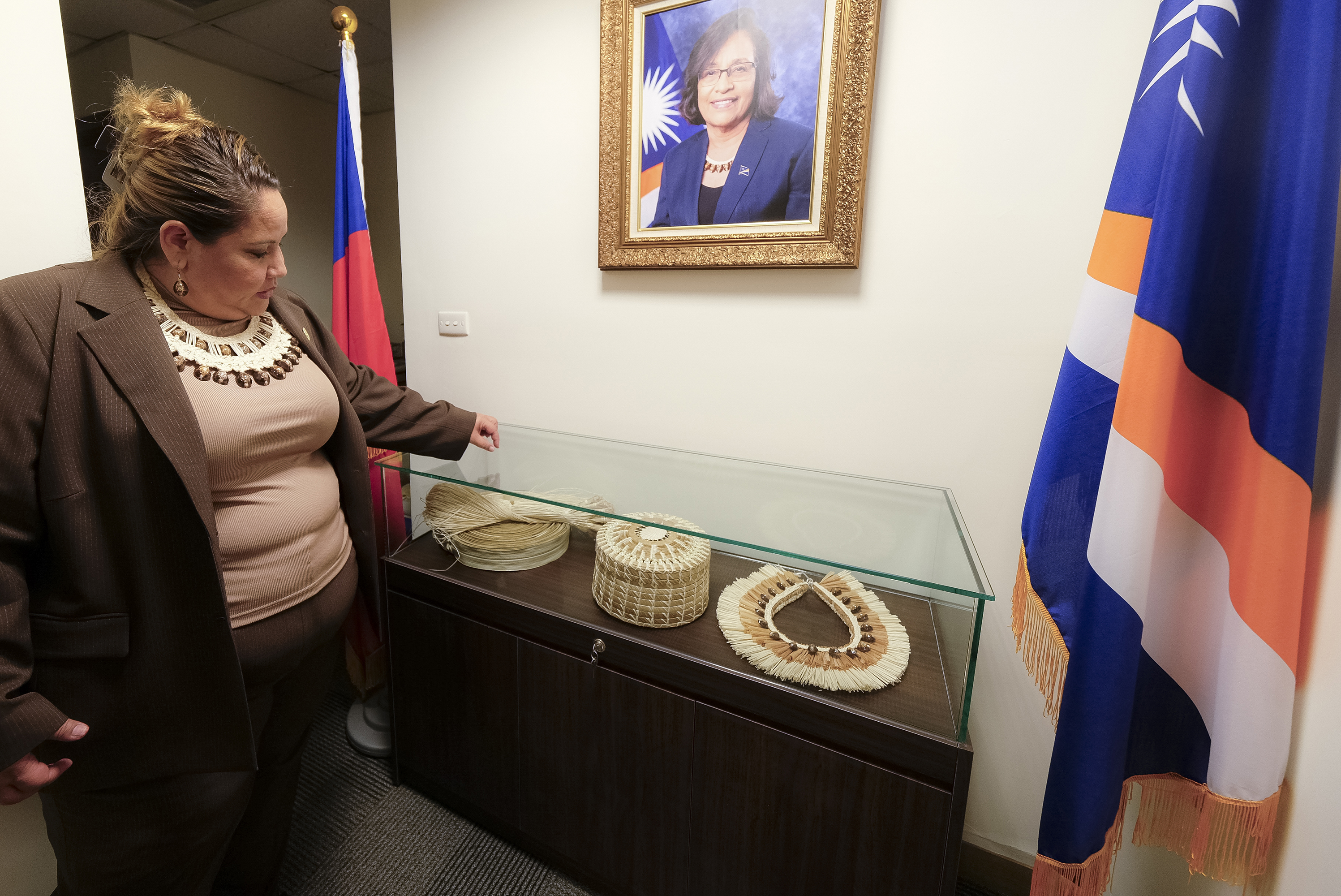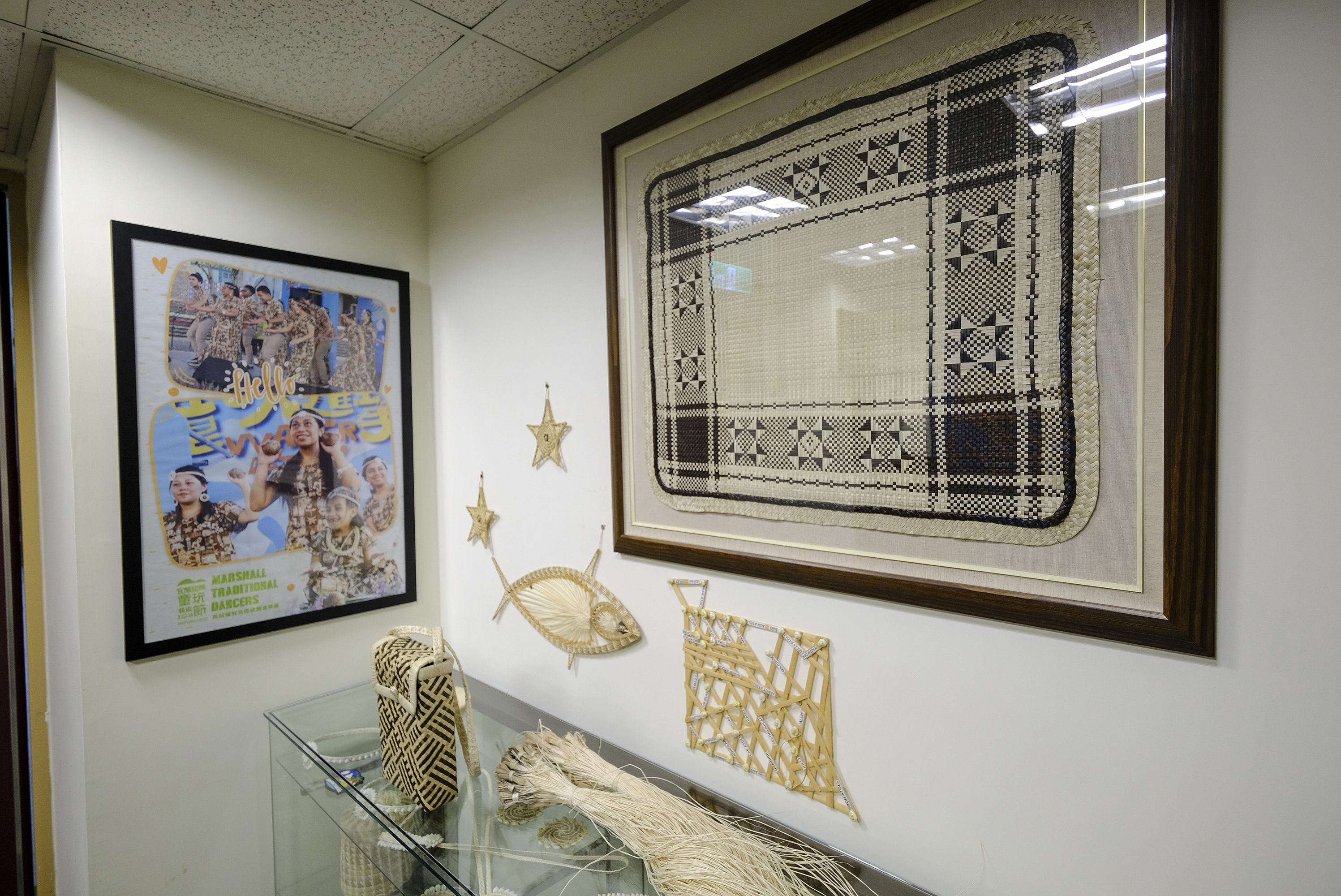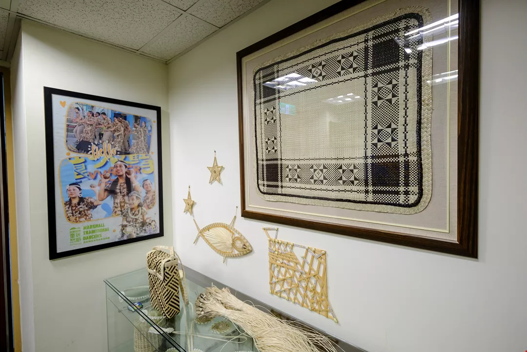 The Marshall Islands embassy in Taiwan has a display of representative Marshallese handicrafts. The photo on the wall shows the tenth RMI president, Hilda Heine.