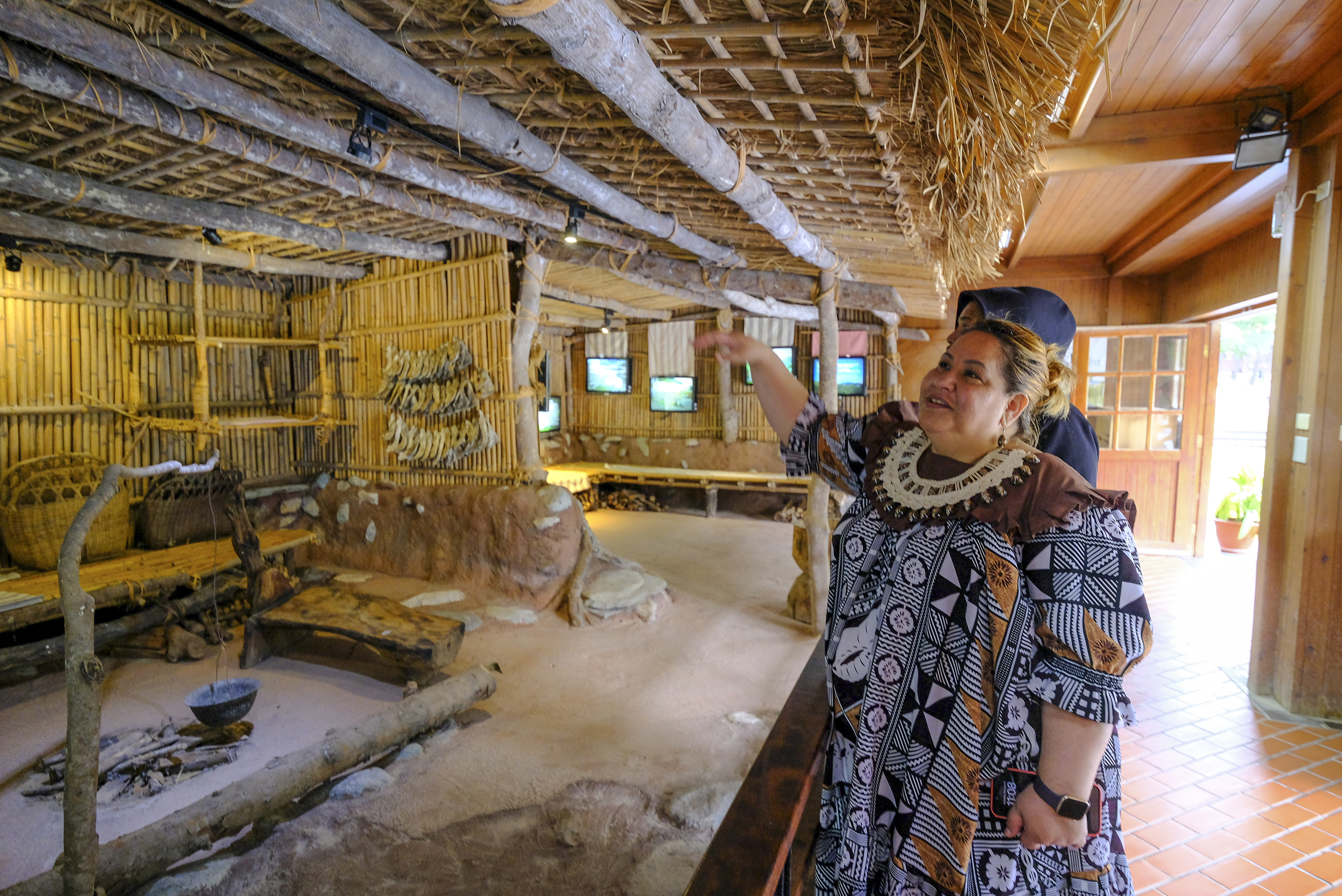 Ambassador Kattil visits a traditional house of Taiwan’s Truku indigenous people. Pointing to the structure of the roof and the layout of the kitchen, she says that these are very similar to traditional houses in the Marshall Islands. The main difference is that the Marshallese used coconut palms for their roofs.