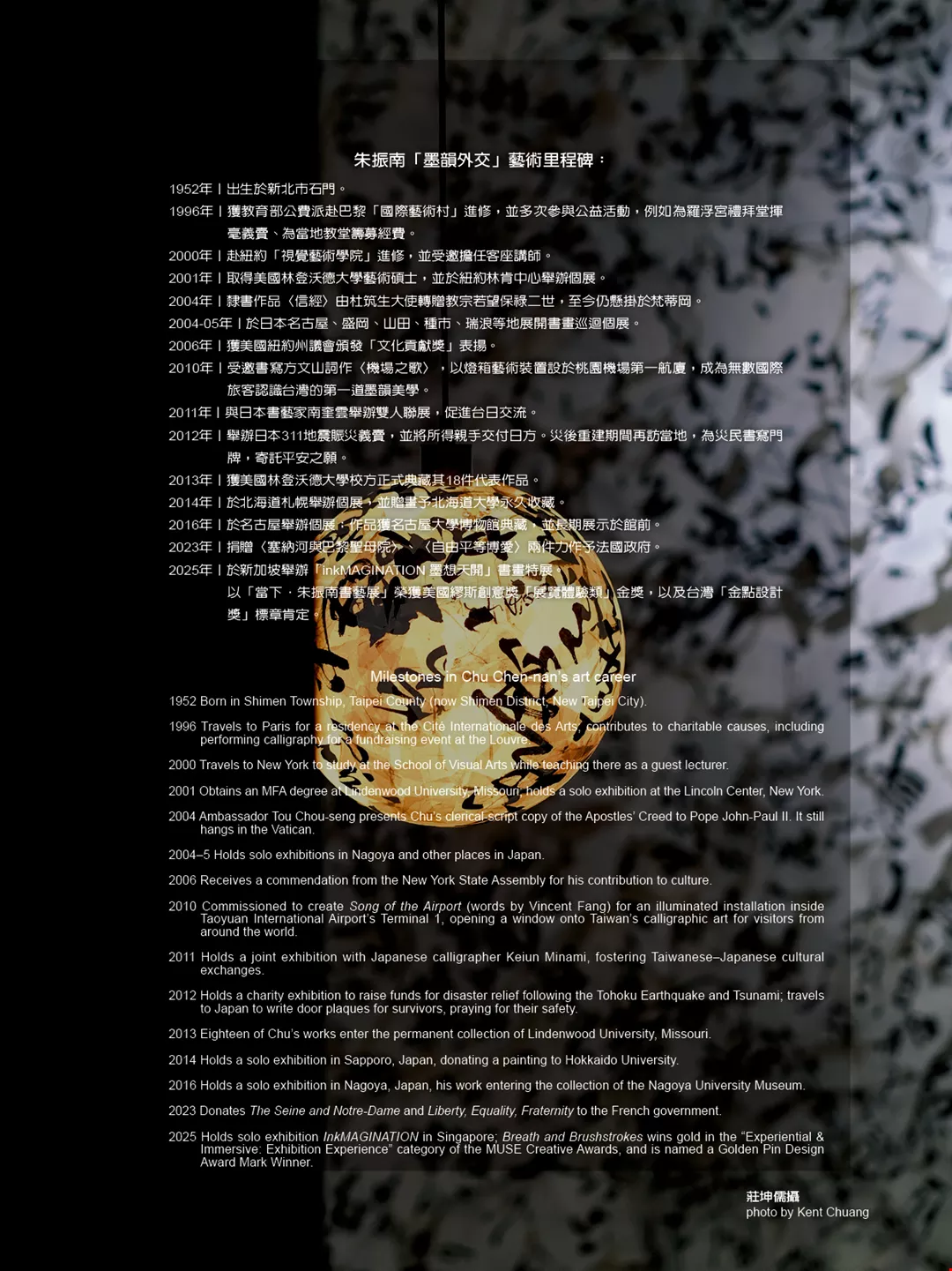 Calligrapher and painter Chu Chen-nan has the courage to venture beyond his comfort zone. As a mature artist, he plunged himself several times into unfamiliar environments in Europe and America to pursue knowledge and inspiration. His gentle and affectionate temperament belies a self-scrutinizing soul ever yearning to transcend boundaries and attain new vistas. These strikingly vivid, if also paradoxical, personal traits have enabled him to breathe a distinctively modern vibe of untrammeled freedom into an art form deeply rooted in tradition.