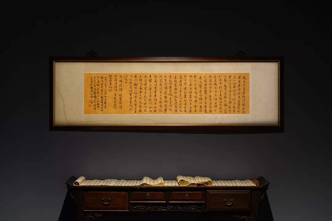 The night before his mother’s funeral, Chu Chen-nan kept watch in mourning next to the coffin. He wrote out The Heart Sutra in the middle of the night. This photo shows the work on display in his 2025 exhibition Breath and Brushstrokes.