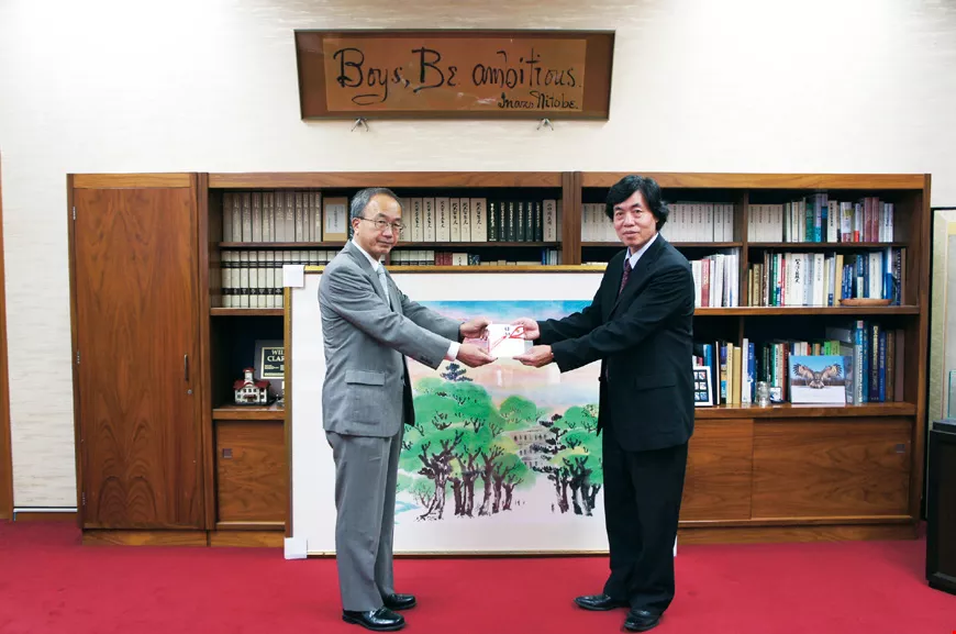Chu Chen-nan donates a painting to Hokkaido University in 2014.
