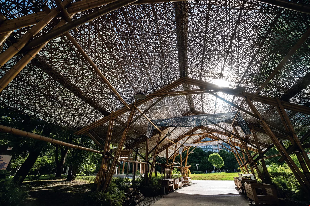 This structure in the Taipei City Hakka Cultural Park was designed by Peter Kan. The bamboo roof filters the sunlight, and the dappled light and shadow give visitors the feeling of walking in a bamboo wood with branches and leaves intertwined overhead.