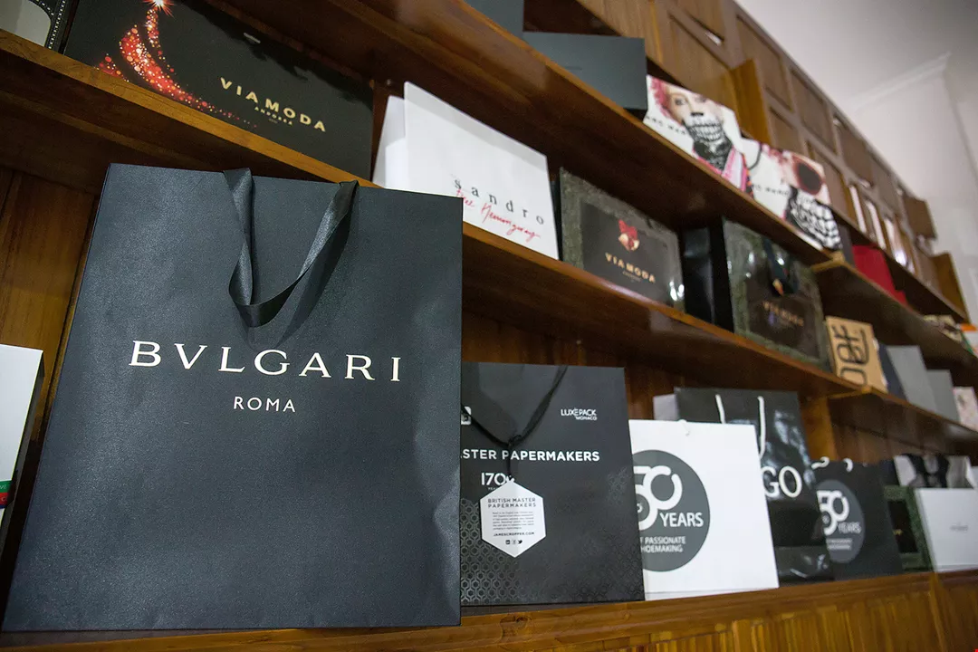 Inside the IDP factory building, we see racks filled with a display of exquisite paper bags marked with the names of European designer brands such as Chanel, Prada, and Gucci—all of which came off IDP’s production lines. In another place are hung four clocks showing the times in Indonesia, China, New York, and the UK, clearly indicating the global domain Yen has built for himself, all starting from a foothold in Indonesia.
