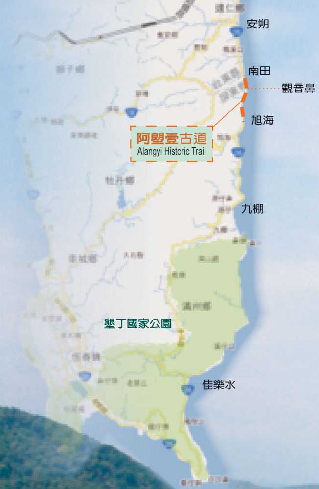 Alangyi Historic Trail is a north-south route stretching about 12 kilometers northward from Xuhai Village, Mudan Township, Pingtung County to Nantian Village, Daren Township, Taitung County. Currently, it’s almost the only stretch of Taiwan’s coast not reached by modern highways. However, the Directorate General of Highways (DGH) carried out an environmental impact assessment in 2002 with a view to extending Highway 26 into this area, in order to complete the highway system encircling Taiwan.