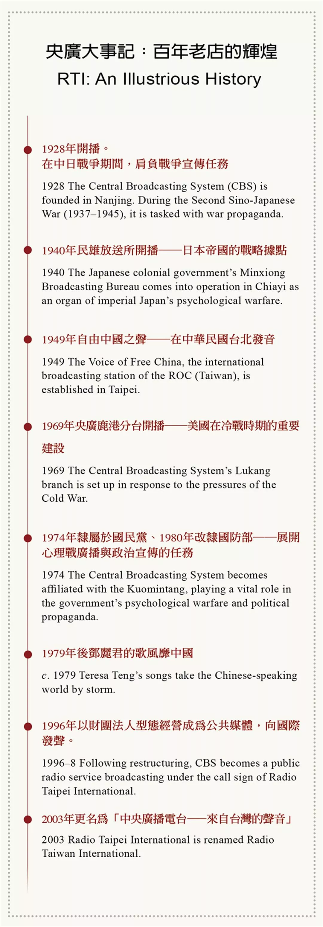 Giving voice to Taiwan in 20 languages, the Central Broadcasting System—under its call sign Radio Taiwan International—broadcasts to some 150 countries. In a tumultuous world, RTI continues to offer companionship and encouragement to listeners, helping them through life’s slings and arrows.