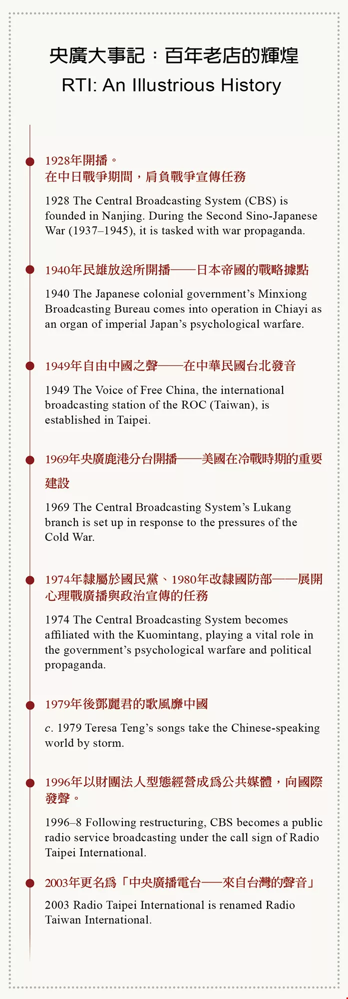 Since the 1950s, the Central Broadcasting System (today’s RTI) has been offering programs in Indonesian, Thai, and Vietnamese for audiences in Southeast Asia.