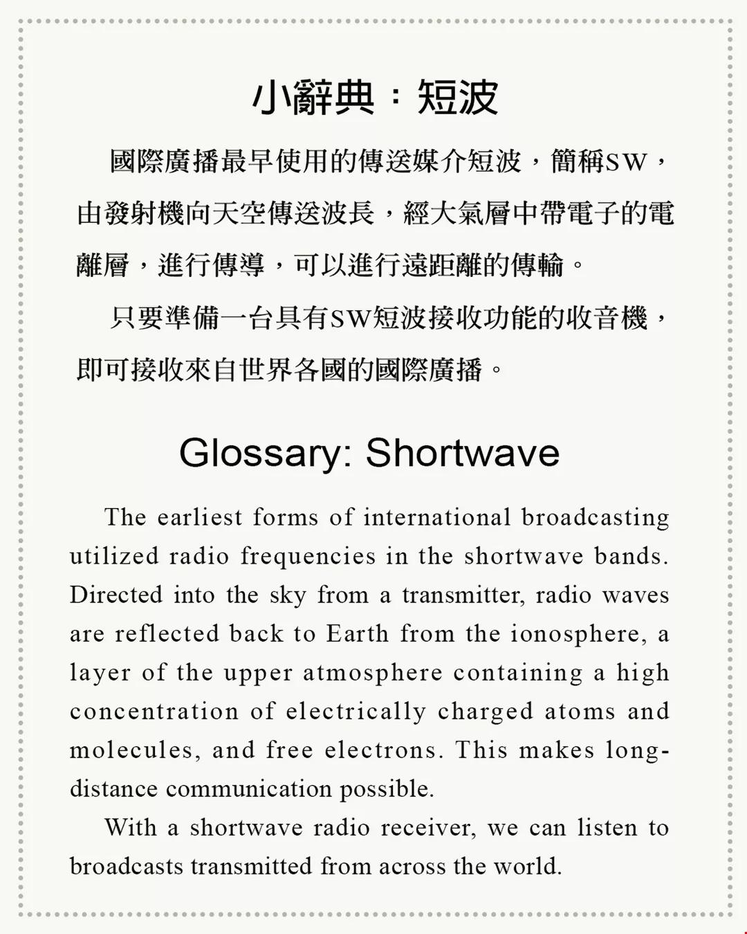 Visit RTI’s website to listen to a wealth of fascinating programs. Or turn on your shortwave radio, pull out the aerial, and twist the tuning knob, and you’ll be greeted by that welcoming phrase “This is Radio Taiwan International” or its equivalent in a dazzling array of languages. Thanks to RTI, voices from Taiwan continue to ripple across the world, speaking to the hearts of listeners both here and abroad.