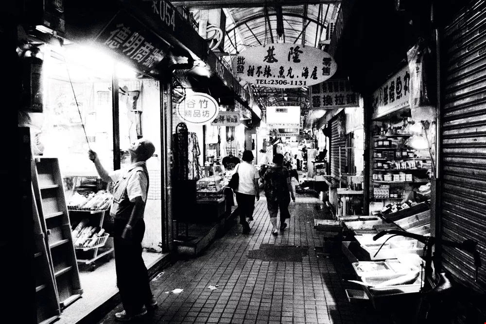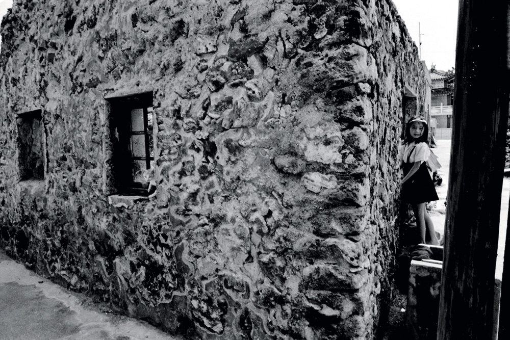 Wu’s shots of Keelung’s traditional market (left) and a coral-stone wall on Penghu (right) evoke loneliness and changing times.