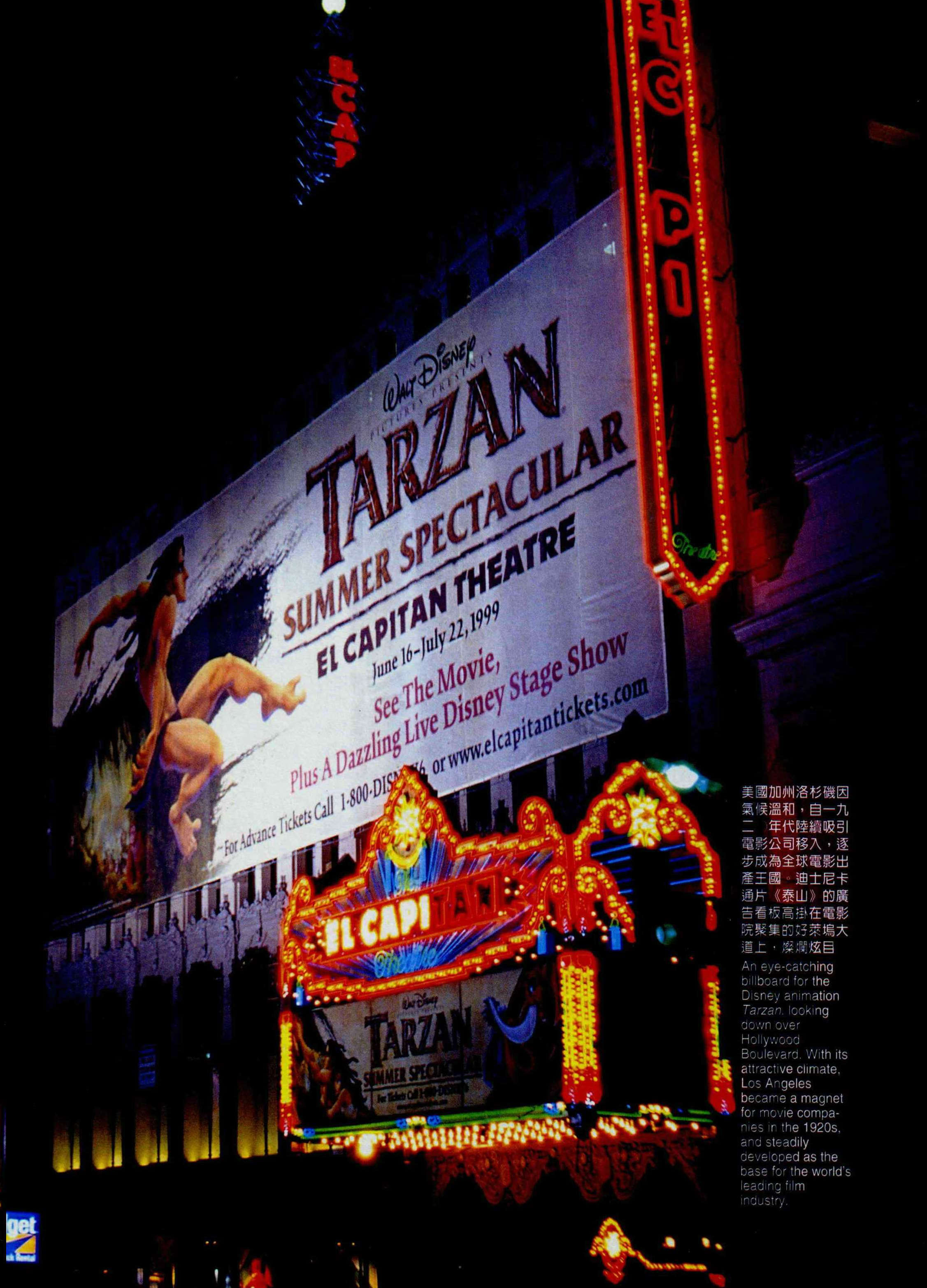 An eye-catching billboard for the Disney animation Tarzan, looking down over Hollywood Boulevard. With its attractive climate, Los Angeles became a magnet for movie companies in the 1920s, and steadily developed as the base for the world's leading film industry.